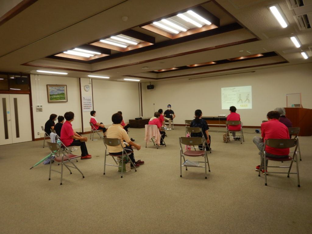 開催日時:令和2年7月22日(水)9:50~12:00開催場所:山武市役所3階大会議室参加対象(人数):1部13名、2部16名開催目的:介護予防開催内容:介護予防体操について講習及び実技所感:コロナ禍ということもあり、2グループに分かれ、それぞれソーシャルディスタンス、マスク等感染予防しながらの開催となりました。緊急事態宣言による外出制限が解除となり、住民の方々も久しぶりにお会いしたようで笑顔が多く見れました。講義、体操ともに熱心に耳を傾けて下さり和やかな雰囲気で行えました。