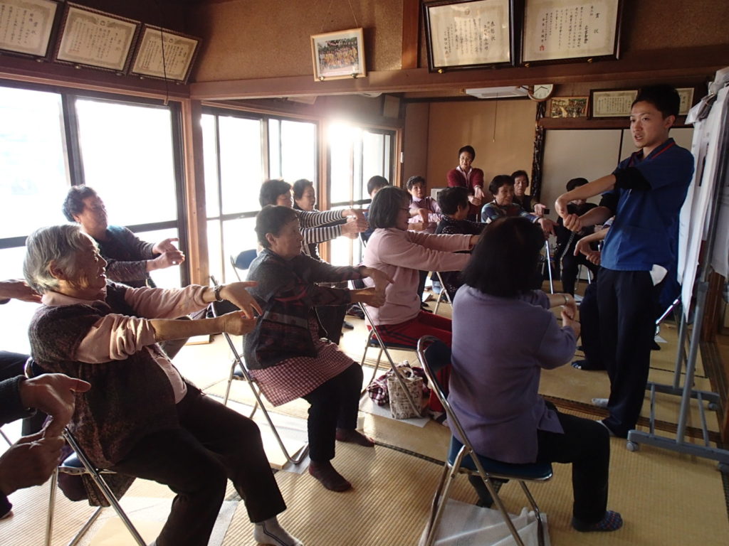 平成29年11月13日、20日と横芝光町上町地区で開催された貯筋運動に参加させていただきました。上町地区は今回が初回とのこともあり、主に問診、バイタル測定、身体測定、体操のオリエンテーション、体力測定までのお手伝いをさせて頂きました。今回は女性の方25名ほどにご参加いただき、和やかな雰囲気の中でスタートしました。