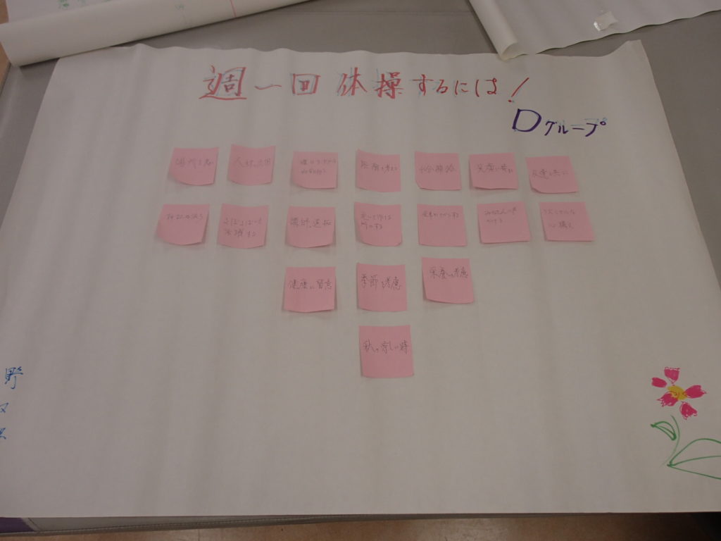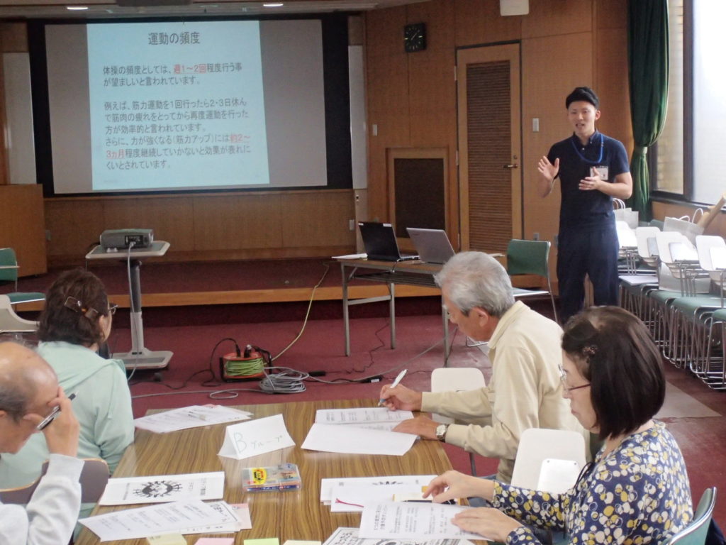 今回「週1回体操するには!」というテーマでグループワークを実施しました。参加者からは「場所の確保、リーダーが必要、交通または連絡手段」など、多くの案が寄せられました。中には体操だけでなく、「お茶会もやりたい」など会話が大変賑やかで楽しそうな雰囲気を感じました。体操では①腰痛、膝痛②転倒③尿失禁④認知症、これらの予防法についてご指導させて頂きました。実際に身体の変化を感じていただくために、ストレッチや頭と身体を同時に動かすコグニサイズを実施しました。時には真剣に、時には笑いもありながら楽しく体操を行って頂けたのではないかと感じます。