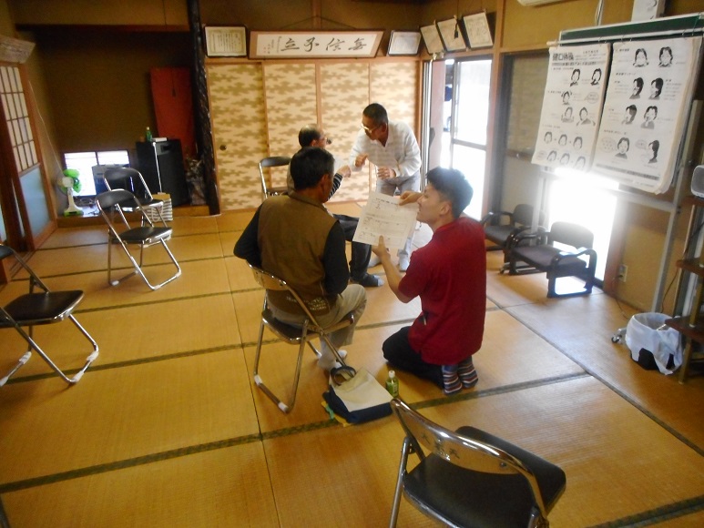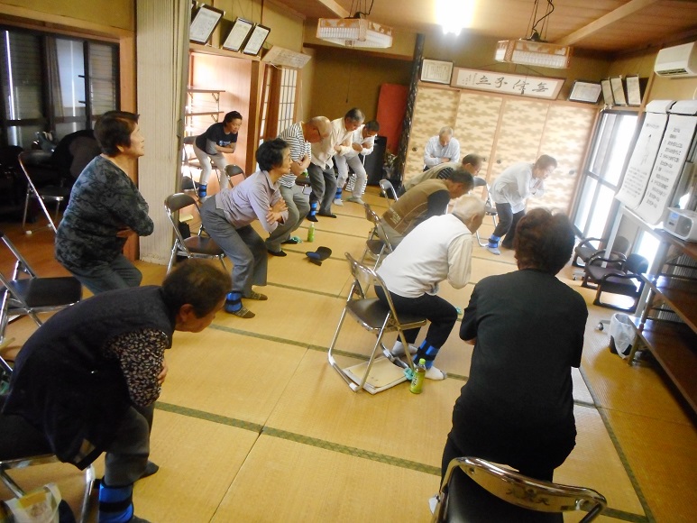 5月21日(月)、横芝光町の大六天区民館に訪問させて頂き、貯筋運動に参加された方々の体力測定の結果返却と体操の指導を実施させて頂きました。この地域での活動は始めてから期間も経ち、体力測定の結果と運動機能の向上が結びついていると感じられます。特にスクワットの筋力トレーニングの質は、我々が同じように実施しても疲れてしまう程のものです。「継続は力なり」とは、まさにこのことだと感じました。
