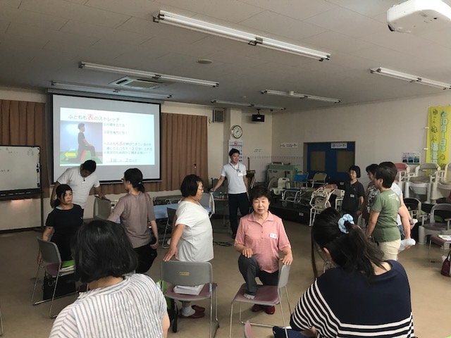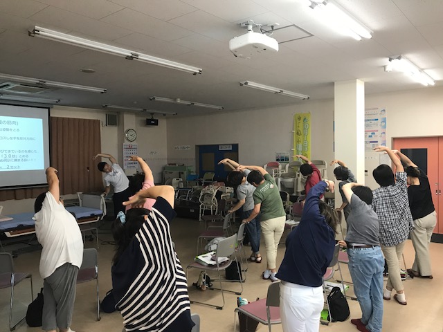 参加者の方々は腰痛を抱えながら仕事を行っている方も多く、トランスファーの方法などご質問を多くいただき関心の深さをうかがうことができました。また、セルフエクササイズでは、仕事中などの合間に出来るようなストレッチを行いました。ストレッチ前後で自己評価をしていただいたのでストレッチすることの大切さを体感していただきました。参加者の皆様が健康で怪我なくお仕事ができるよう、これからも微力ながらご支援させていただきたいと思います。