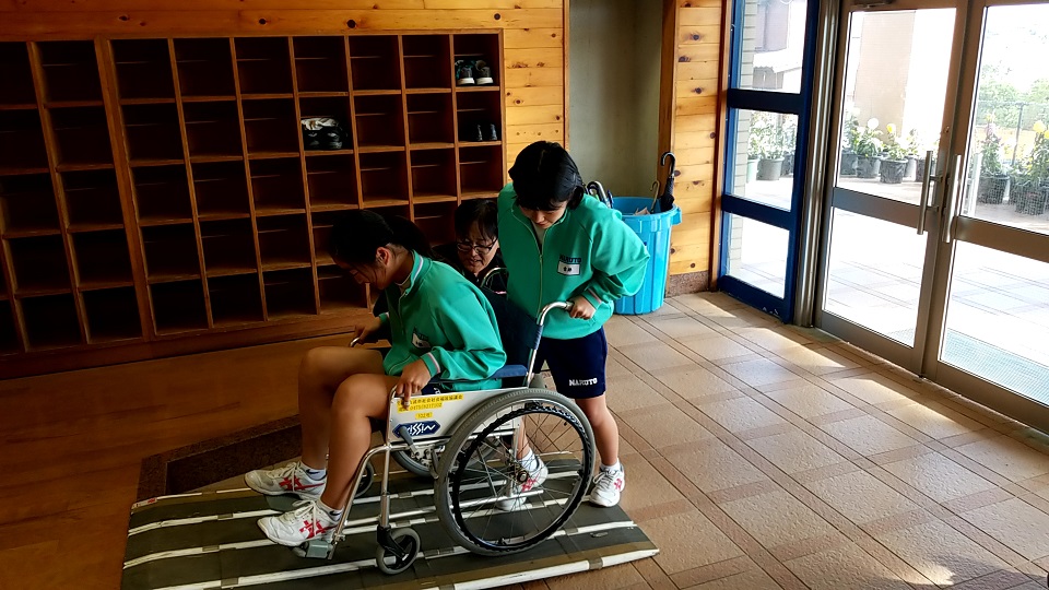 高齢者疑似体験は、疑似体験キットを装着した状態でのYシャツの着脱や色塗りを体験してもらいました。地域のボランティアの方々が協力して下さり、キット着脱のお手伝いなど生徒たちが円滑に体験を進められるように協力をして頂きました。地域交流の場としても非常に重要であると感じました。車いす体験では人を乗せた状態でどのように工夫すれば安心して段差を昇降できるのか考えながら行なっていただきました。生徒たちは楽しみながらも試行錯誤している姿が印象的でした。