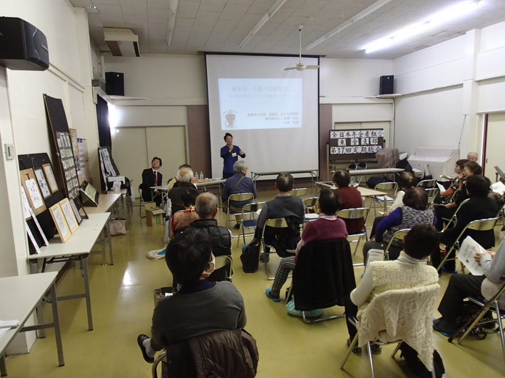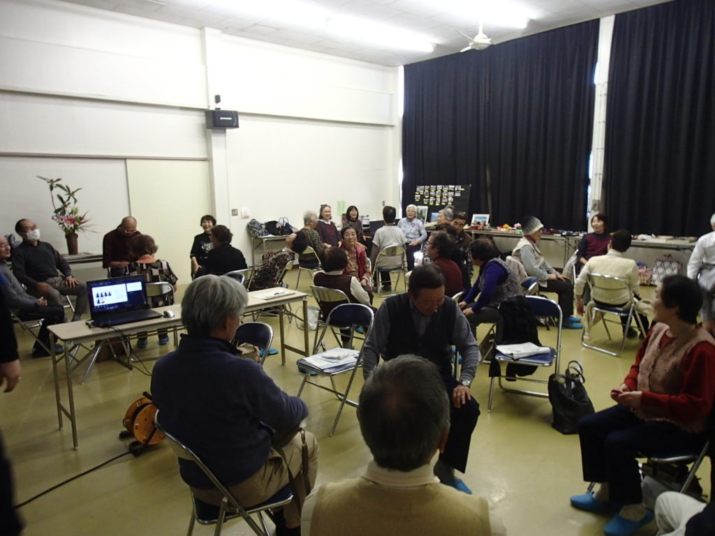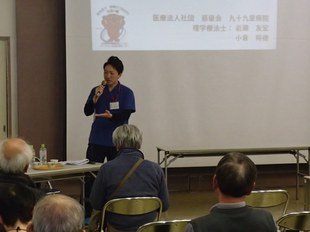 平成29年12月3日(日)に、東金市大和公民館にて年金組合に加入されている方々、約40名に対して介護予防勉強会を実施させて頂きました。主に介護予防を目的とした自宅や集いの場で簡単に行えるような体操の実践、指導をさせて頂きました。今回、参加者は女性が8割であり、和やかで華やかな雰囲気の中で勉強会を行うことができました。