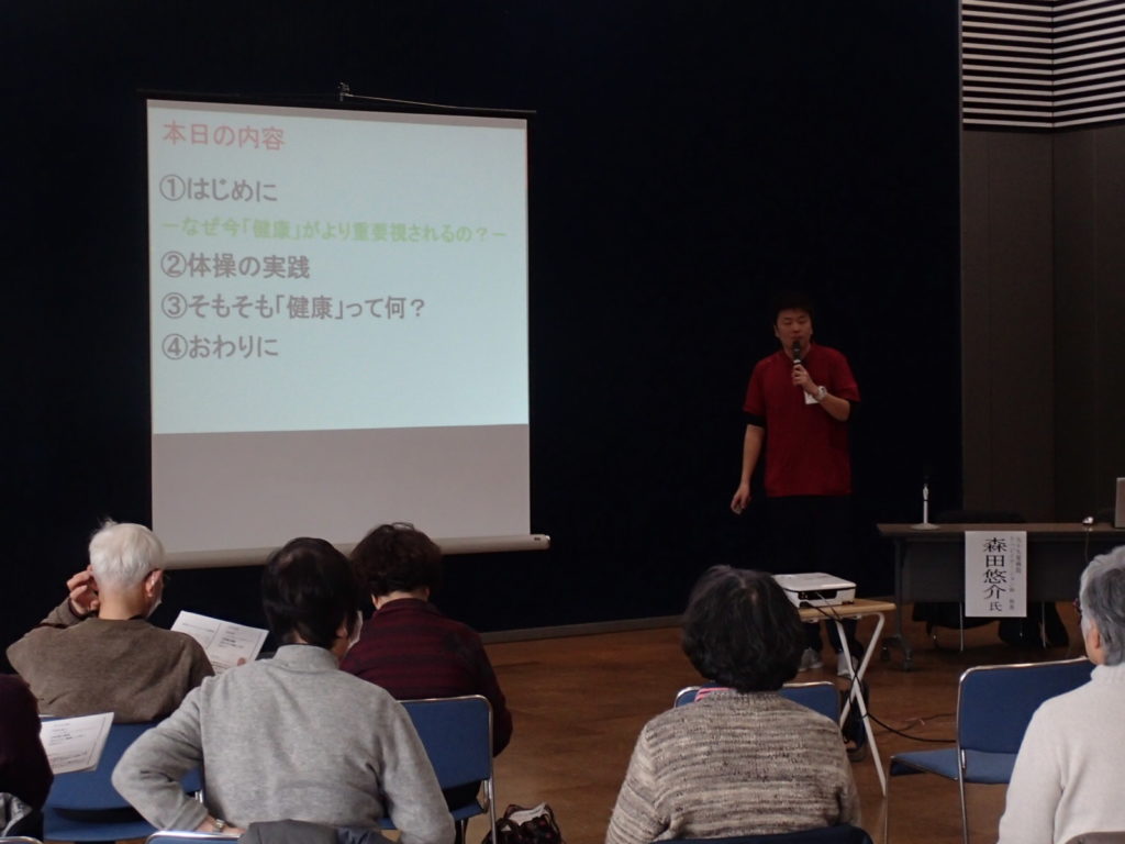 平成30年1月29日、東金市にてロコモティブシンドローム予防講座に参加しました。今回は男性の方も多く総勢15名程にご参加いただきました。今回は社会に出ていくこと、元気でいることの重要性に加えロコモと言うこともあり歩行(移動)に着目してお話させて頂きました。何気なく普段歩いていますが、どのようなタイミングで筋肉が使われるのか、またしっかりとその筋肉が働かないとどのような障害が出るかなどを知って頂き、筋力トレーニング中心とした内容を実施。普段健康を意識して体を動かしている方が多かったですが、そのような方々でも体操の注意点を抑えて実施してみると実はキツイ!!シンプルだけど効率的!そんな運動をご提示させて頂きました。