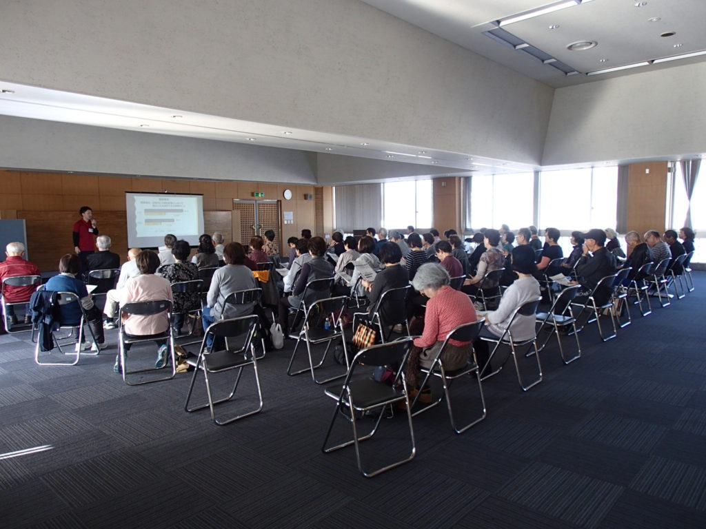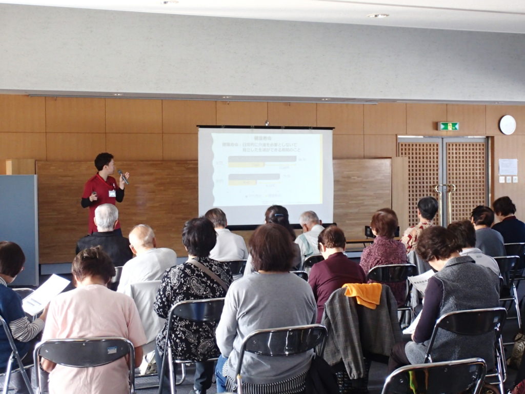 平成30年11月10日、東金市役所にて『ロコモ予防講座』に参加させていただきました。寒さが一層増す中、総勢60名程の方々が参加してくださいました。ロコモとは、『ロコモティブ症候群』のことを指し、転倒による骨折や年齢に伴って起こる関節炎などが原因で、「立つ」「歩く」といった機能が低下してしまう状態を言います。講習の中では、ロコモによって引き起こる危険性等を説明させていただきました。