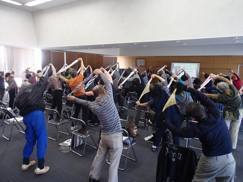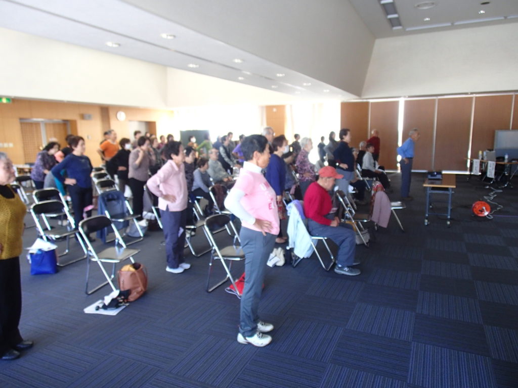 またロコモ予防に対する体操では、聞き馴染みのある曲に合わせた体操を取り入れて実施させていただきました。途中バランスが崩れそうになったり、手足が左右逆になってしまったりと苦戦する場面も見られましたが、曲を口ずさんだり楽しそうに体操をされていました。終了後には沢山のご質問やご指摘をいただき、今後の活動する中での課題として更に尽力していきたいと感じました。東金市役所の皆様、参加された住民の皆様、ご協力いただきありがとうございました。