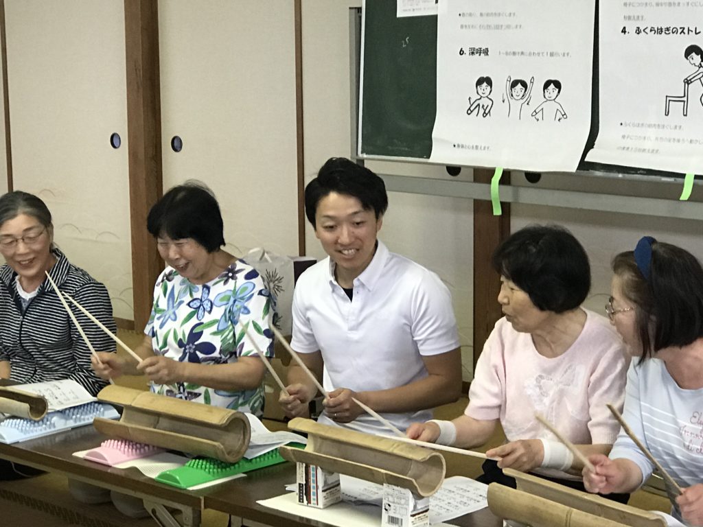 運動の種類によっては数を数えるだけの参加の方もいましたが、参加者同士で助け合い、工夫しながら健康維持のために体を動かしている姿がとても印象的でした。運動後に皆様と一緒に実施した竹太鼓は、隣の方に優しく指導を受けながら何とか最後まで行うことが出来ました。