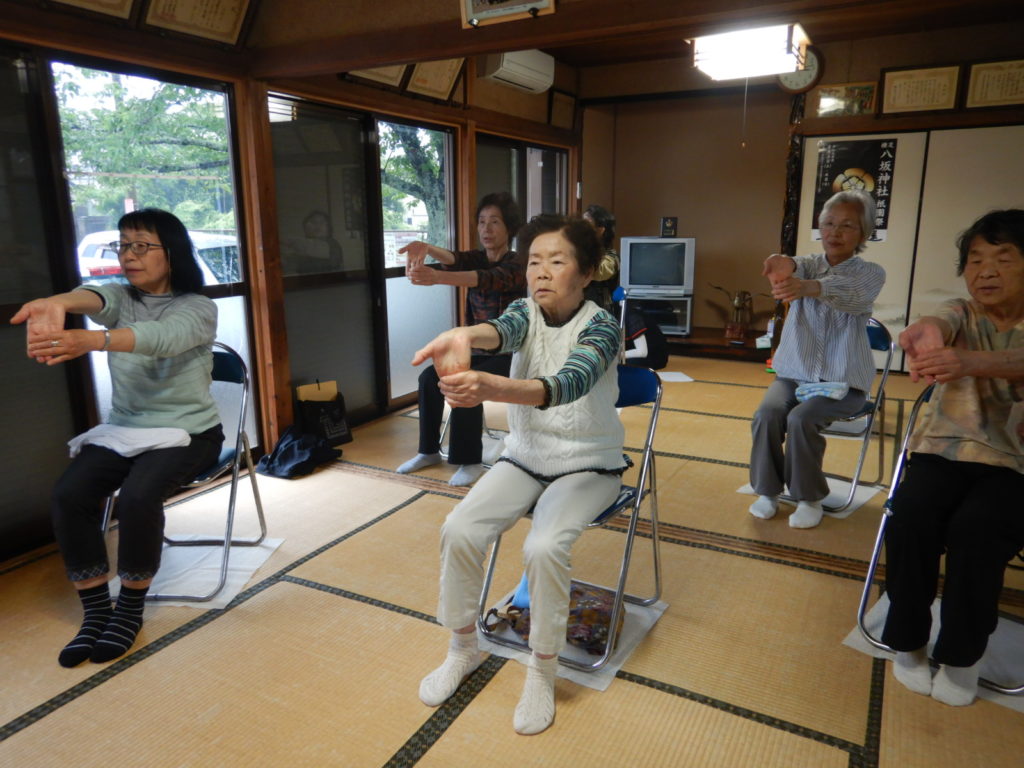 また、6月19日(水)に栗山南部地区へ体力測定結果返却に伺いました。健康に対する意識・意欲が非常に高く、運動能力も高い方が大勢いる地区であり、「貯筋運動」の運動強度(負荷量)に対してアドバイスを頂きたいとの申し出がありました。結果返却後に貯筋運動を実施し、基本的な運動は変えずに負荷量を上げる方法を伝授しました。レベルが高い地区ならではで、運動に対する意欲が高くとても素晴らしいと感じております。次回の体力測定が楽しみです。