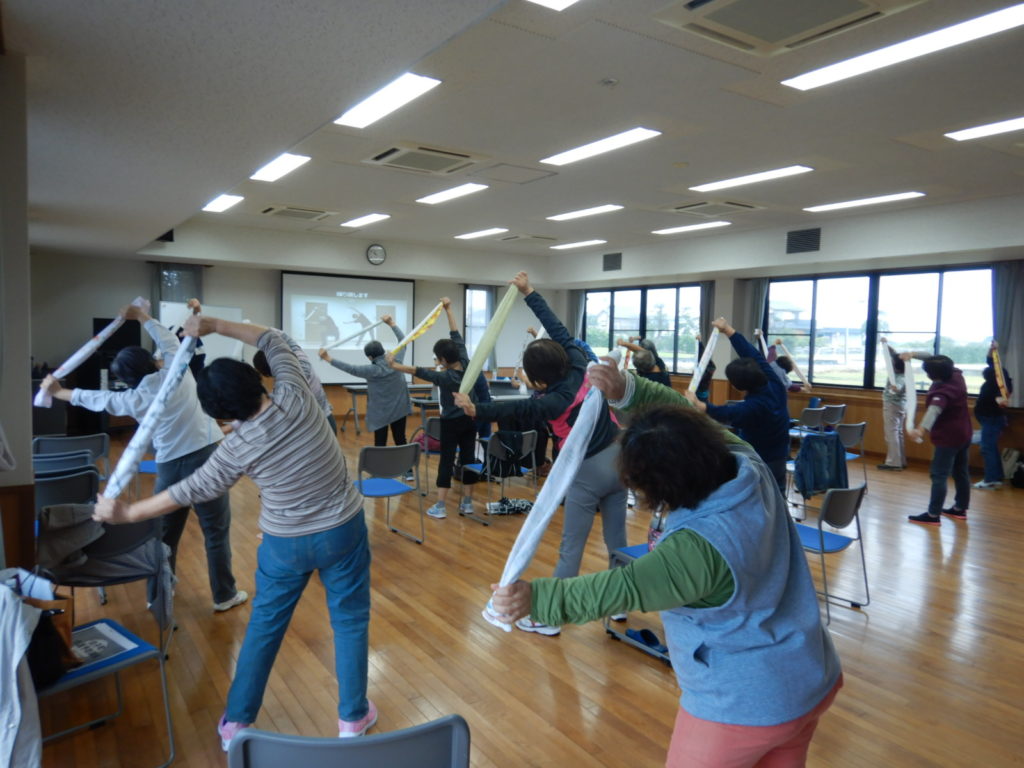 10月29日(火)、白子町の白潟ふれあいセンターにて介護予防教室を実施してきました。まず25日に千葉県を中心とした豪雨により、山武長生夷隅圏域も多くの被害を受けました。このような状況にも関わらず、総勢26名と多くの方にご参加いただいたこと深く感謝致します。