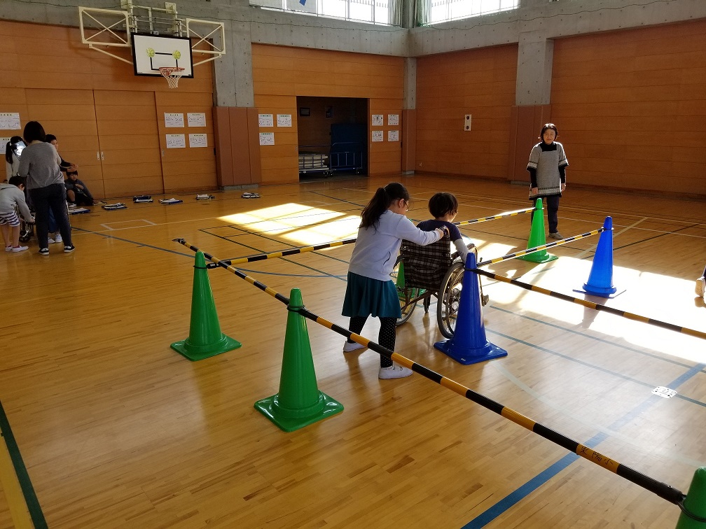 車椅子体験では、車椅子について注意事項などを学んだ上で、車椅子の介助と車椅子の自走方法を学んで頂きました。介助で段差をこえたり、自走でクランクを進む等、車椅子操作の基本から応用まで学ぶことができました。「ここのパーツは何ていう名前ですか?」等の質問もあり、少しだけ車椅子に対して興味を持ってくれたのではないかと感じました。