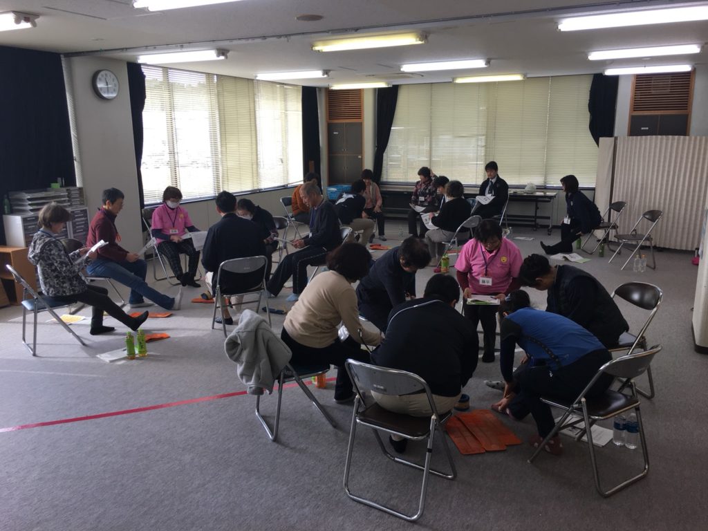 グループワークでは、実際の集いの場を想定して1人ずつ体操の号令をかける練習を行いました。はじめて行う方が多い中、物怖じせずに大きな声を出して号令をかけている姿はとても頼もしく感じました。説明の中で解かりづらいところがあればグループの中でお互いに案を出し合う姿もあり、内容の濃い時間となりました。