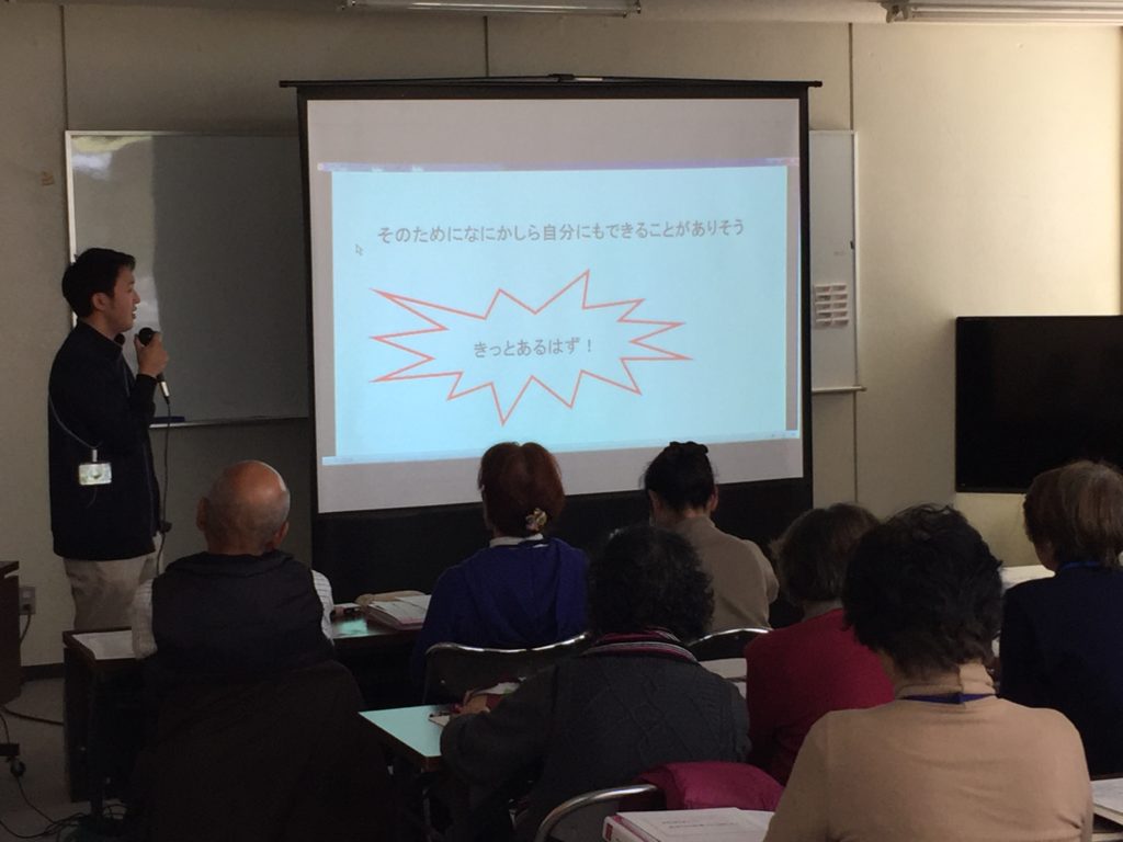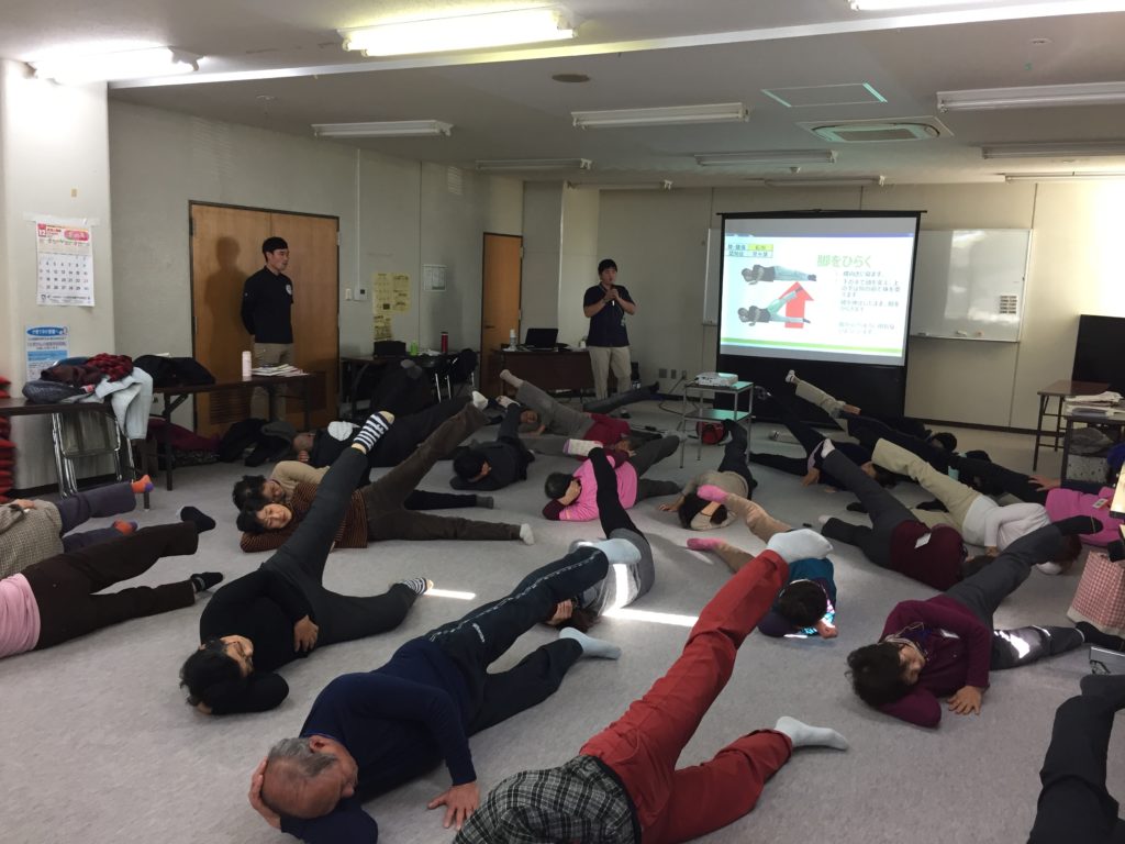 今回の勉強会には、当圏域広域支援センターのリハ・パートナーである“エスポワール大原”から2人の理学療法士が先頭に立って勉強会を仕切って下さいました。前回の第1回目も渡邊先生に先人を切って頂きましたが、今回は渡邊先生に加えて、後輩の矢野先生にも体操について指導して頂きました。「椅子のない通いの場」を想定して2人一組で行う運動や床に横になって行う運動はどれも理にかなっており、参考にしたくなる内容でした。またペアになることで参加者同士の自然な会話が増えて笑顔がみられました。