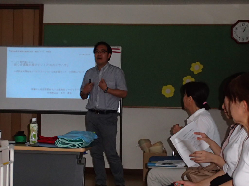 千葉県介護福祉士会南部ブロックのみなさまを対象に、リハビリ専門職による「長く介護職を続けていくためのノウハウ」山武長生夷隅地域リハビリテーション広域支援センターの役割についてお話しをさせていただきました。介護に従事されている方の腰痛発生件数は年々増加しております。今回は、腰痛予防に焦点をあてて実技、体験を通してお伝えさせていただきました。ご質問などから日々、介護方法にご苦労されている様子を伺うことができました。リハビリ専門職が介護方法についてアドバスができるシステムを構築していく必要を感じました。今後も介護職の方々、介護を受ける方々にとって最善の介護方法を考える機会をつくっていきたいと考えております。