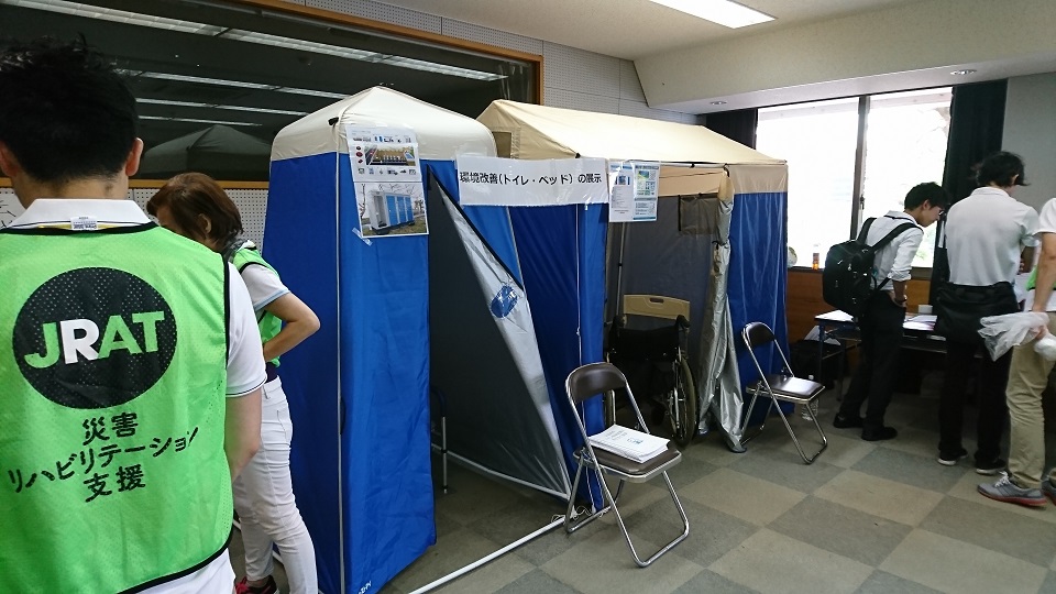 8月26日に匝瑳市で行われた、9都県市合同防災訓練に参加してきました。主に、避難所での生活を想定した訓練とリハビリテーションの防災フェアでのスタッフとして活動してきました。内容は、災害時に役立つ便利グッズなどの紹介、嚥下障害を持つ方への食事の紹介や近年の災害時によく聞くようになったエコノミークラス症候群の予防方法や災害時のトイレ・ダンボールベッドなどの紹介を行いました。近隣住民の方々や防災訓練の参加者の方々など数多くの方々にご来場頂けました。来場者の皆様は、今回の防災フェアでの内容にとても興味を持って頂けたことを嬉しく思います。これからも、広域支援センターとして地域に貢献できるように努力していきます。
